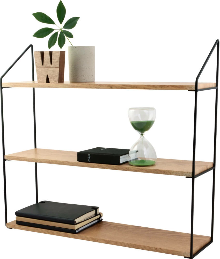 Stilig opphengbar hylle i pulverlakkert mdf/metall. 60x15x54cm. Skruer og plugger medfølger ikke.