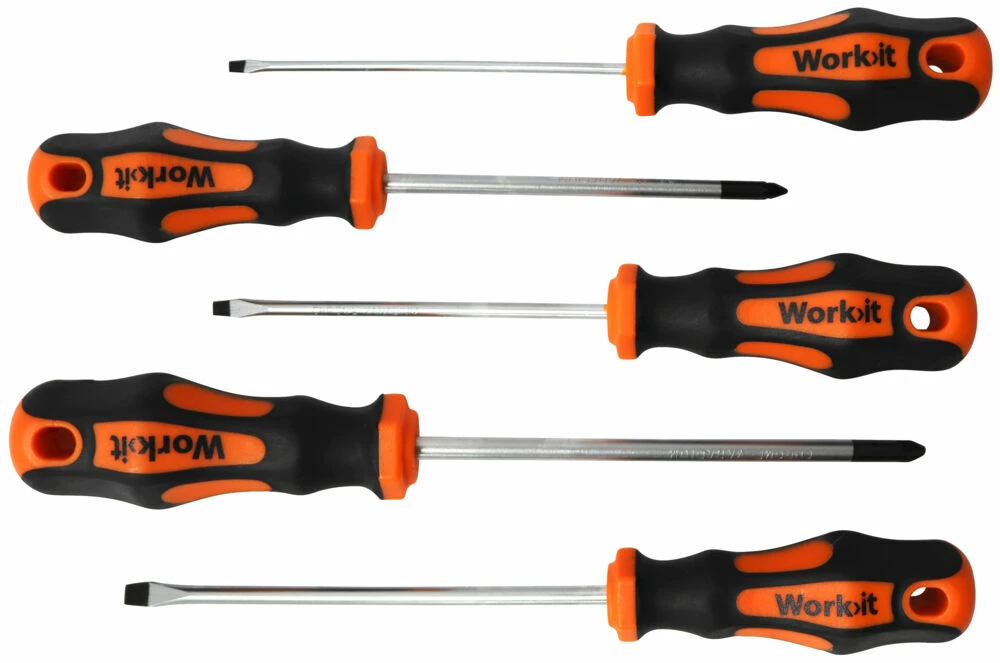 Work>it Skrutrekkersett kombi 5 deler, CRV-stål med mattslepet klinge, ergonomisk grep.