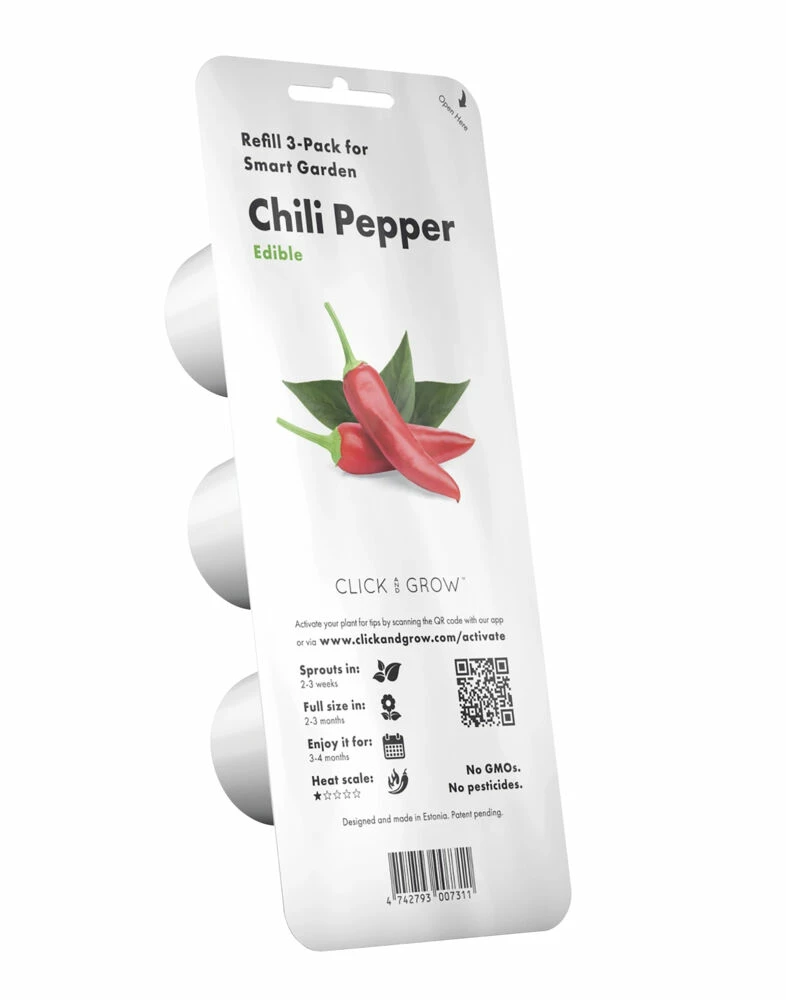 Click&Grow refill chili inneholder plantekapsler med chili, for å kunne dyrke frem chili. Plantekapslene er biologisk nedbrytbare. Kapslene inneholder ingen skadelige kjemikalier.