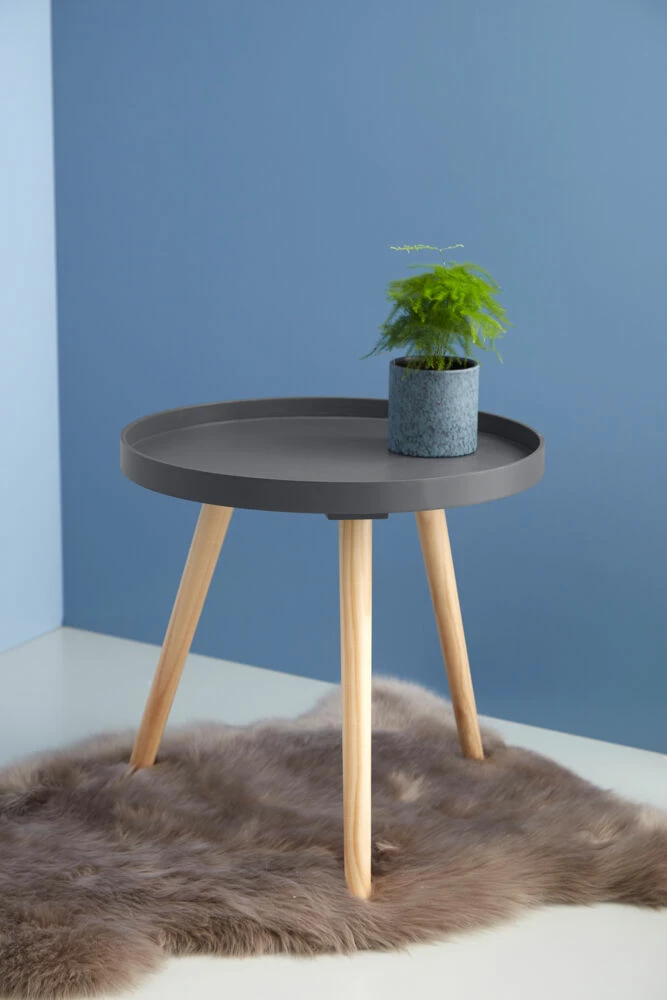 Day bord, Ø 41 cm. Med grå bordplate og treben. Bordplaten er MDF.