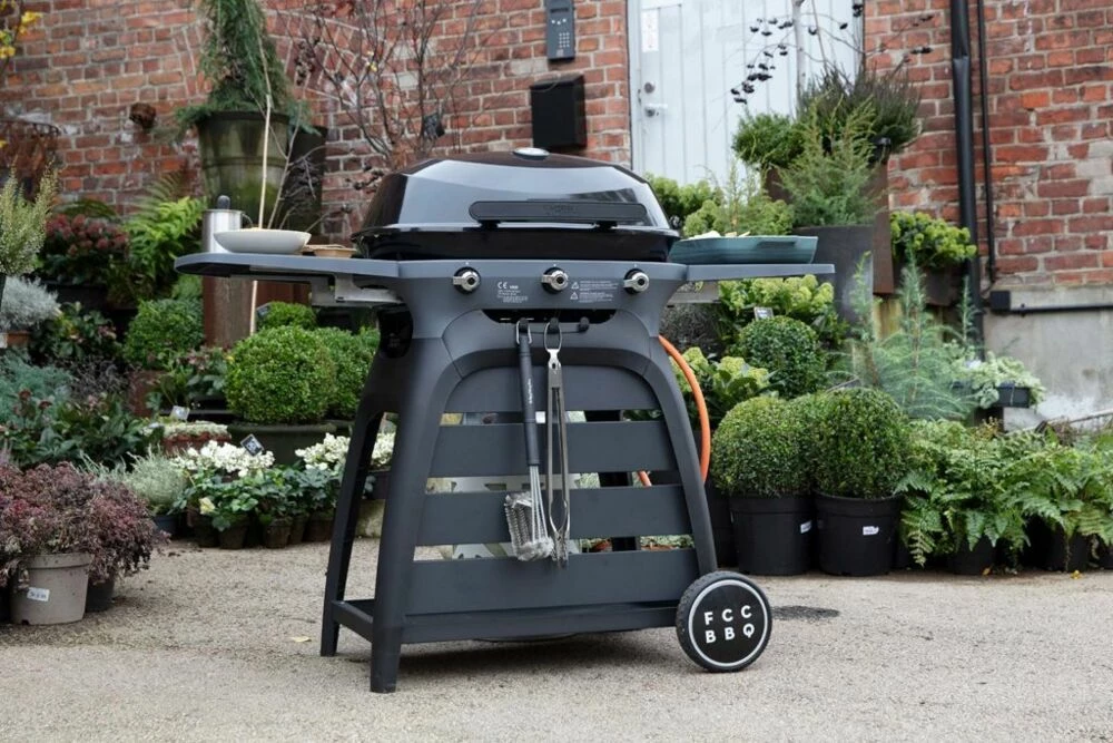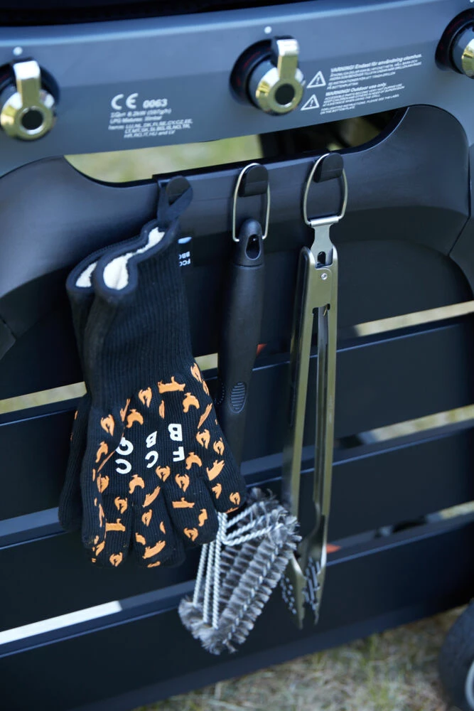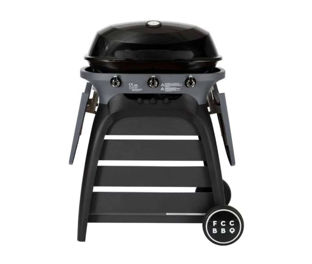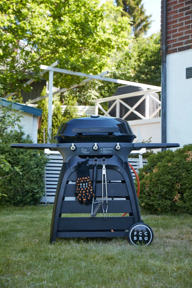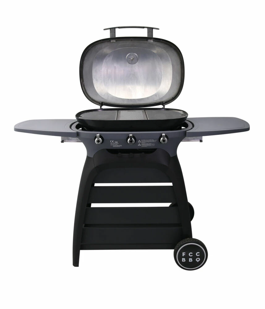 FCC BBQ X-Grill Chef har 3 U-formede brennere i stainless steel, som også gjør grillen godt egnet for inndirekte grilling. Grillflaten er på 67×45 cm og har porselens emaljerte støpejerns rister med en stekeplate i senter. Sidebordene er foldbare som gjør grillen kompakt ved oppbevaring. 3 kroker til oppheng av redskaper i front og 2 hjul som gjør den enkel å flytte.