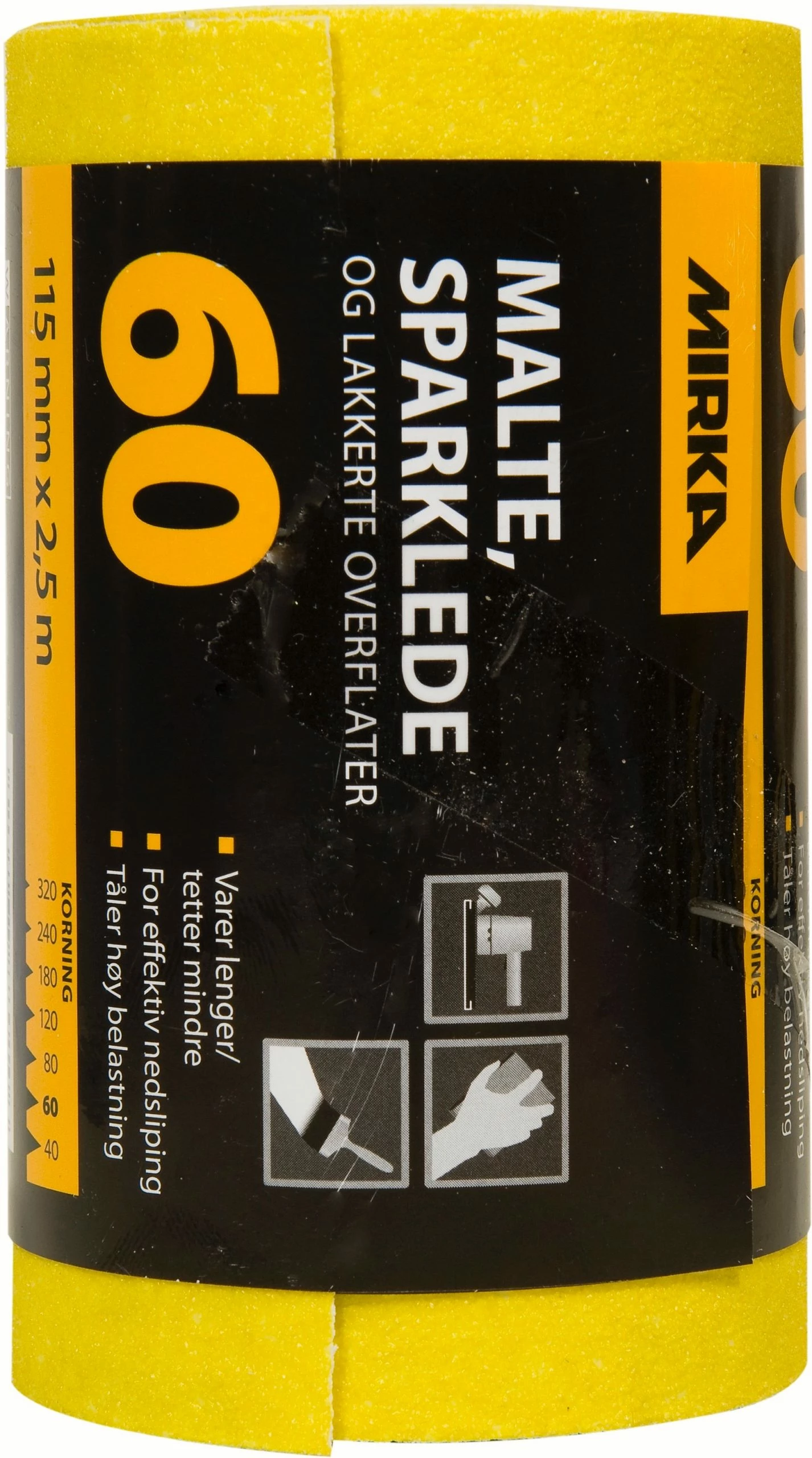 Mirka sandpapir med stearatbelegg som motvirker gjengroing ved sliping på lakk og maling. For effektiv nedslipning og tåler høy belastning. Mål: 115 mm x 2,5 m. Ulike korning: 40, 60, 80, 120, 180, 240, 320.