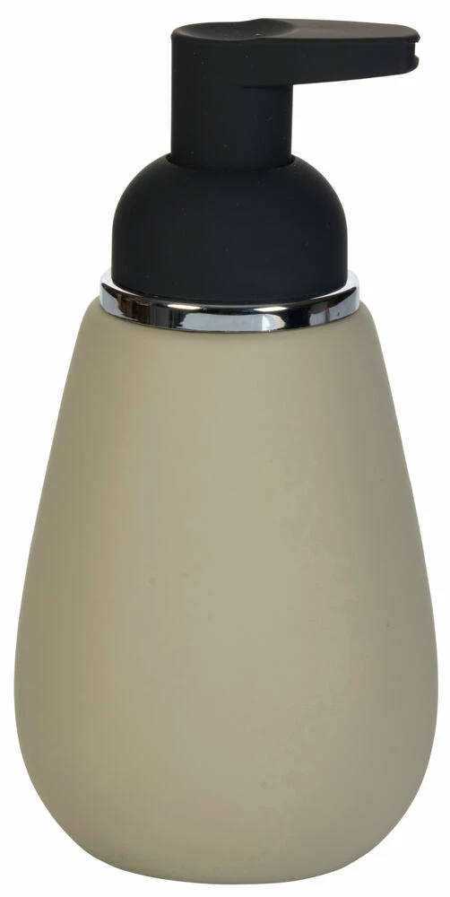 Såpeskumdispenser i porselen med matt gummilakkering og plast med forkrommet lakkering.