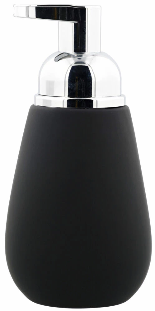 Såpeskumdispenser i porselen med matt gummilakkering og plast med forkrommet lakkering.