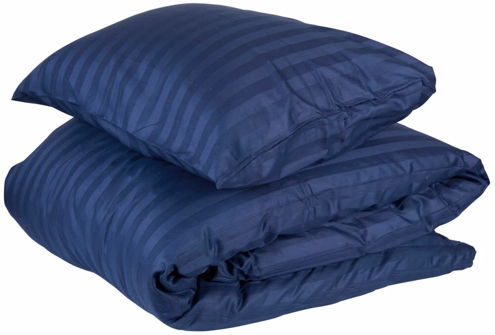 Delikat og behagelig sengesett i fin økologisk bomullssateng. Med striper og i fargene blå, krem og grå.