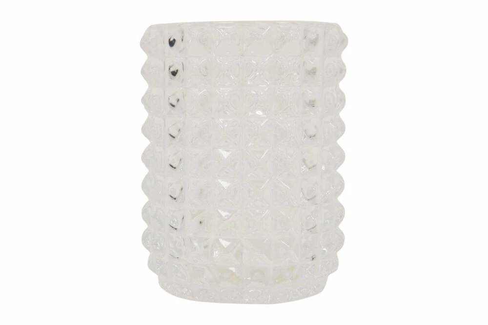 Delikat tilbehørsserie i diamantmønstret glass i kombinasjon med sølvfarget metall.